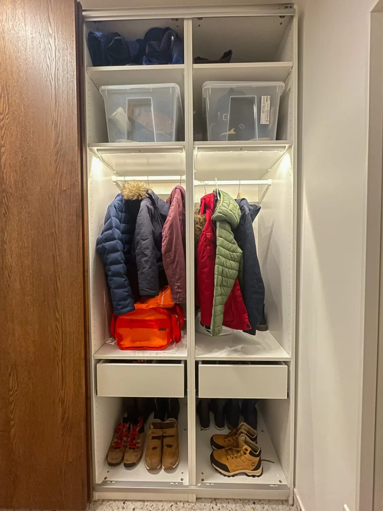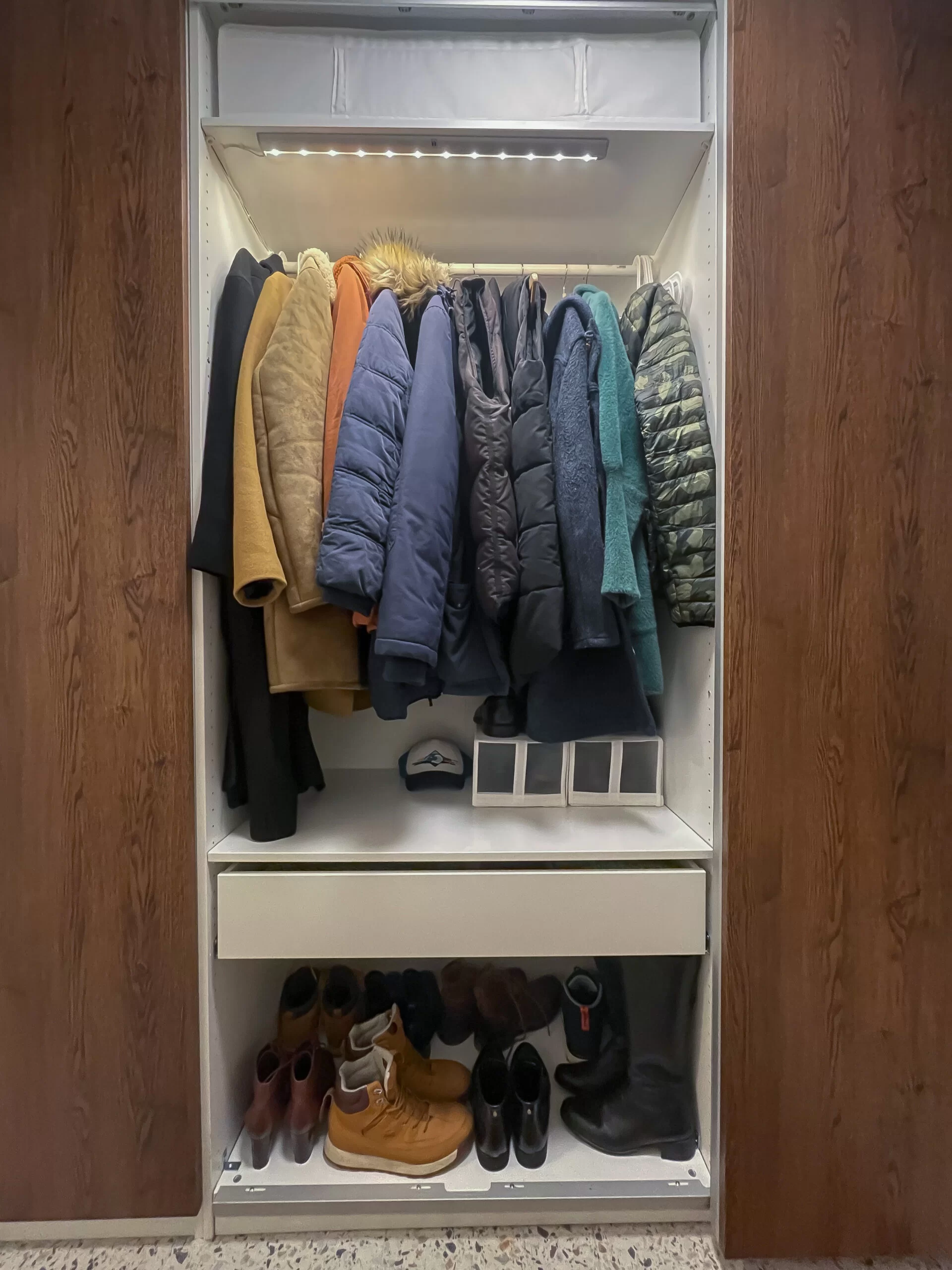 Szafa PAX o szerokości 100 cm to nasza główna szafa. To tutaj trzymamy ubrania wierzchnie i buty moje, mojego męża i naszych gości.