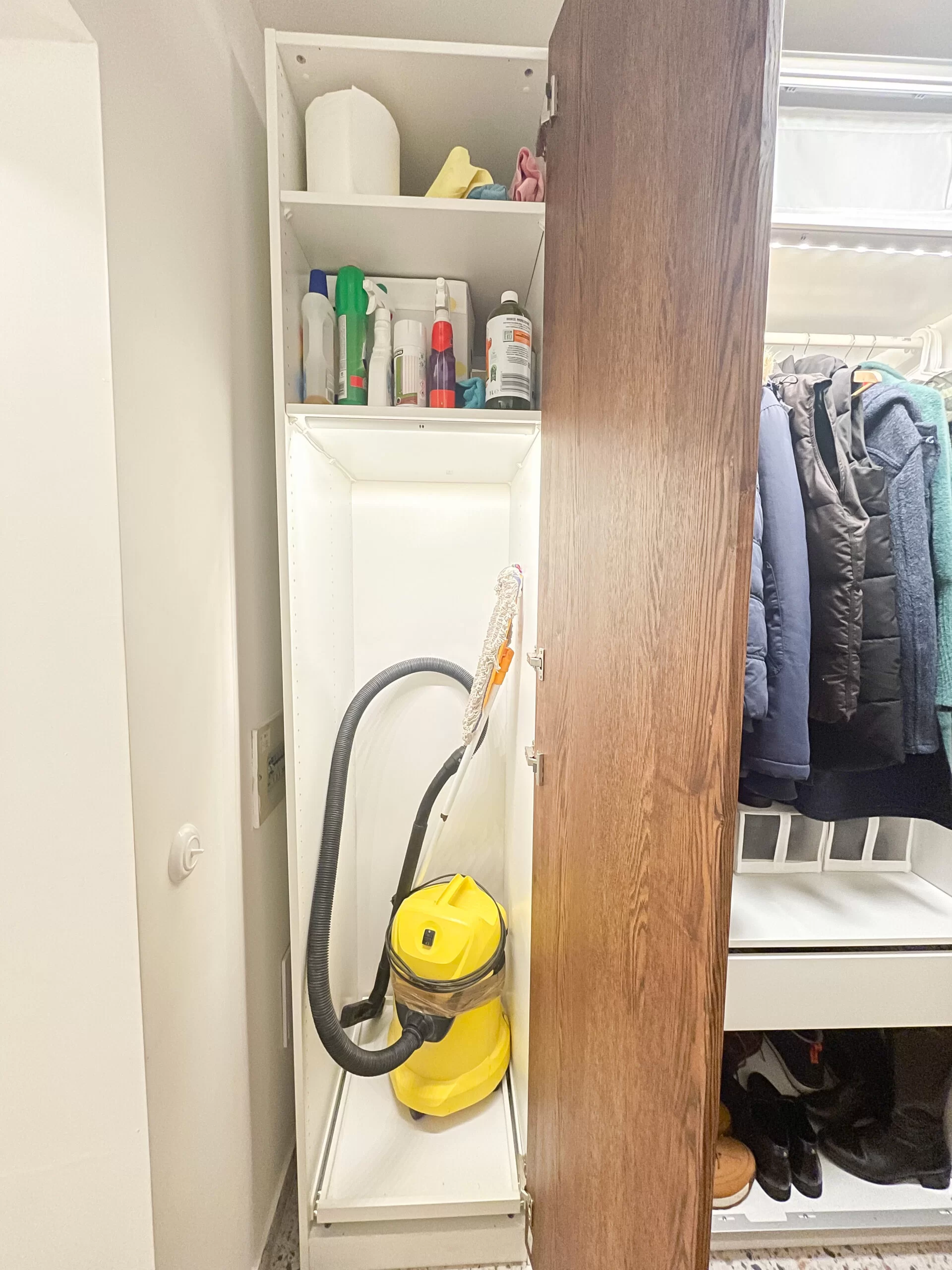 - to również tutaj chcieliśmy wygospodarować miejsce na odkurzacz, środki czystości i niewielką deskę do prasowania