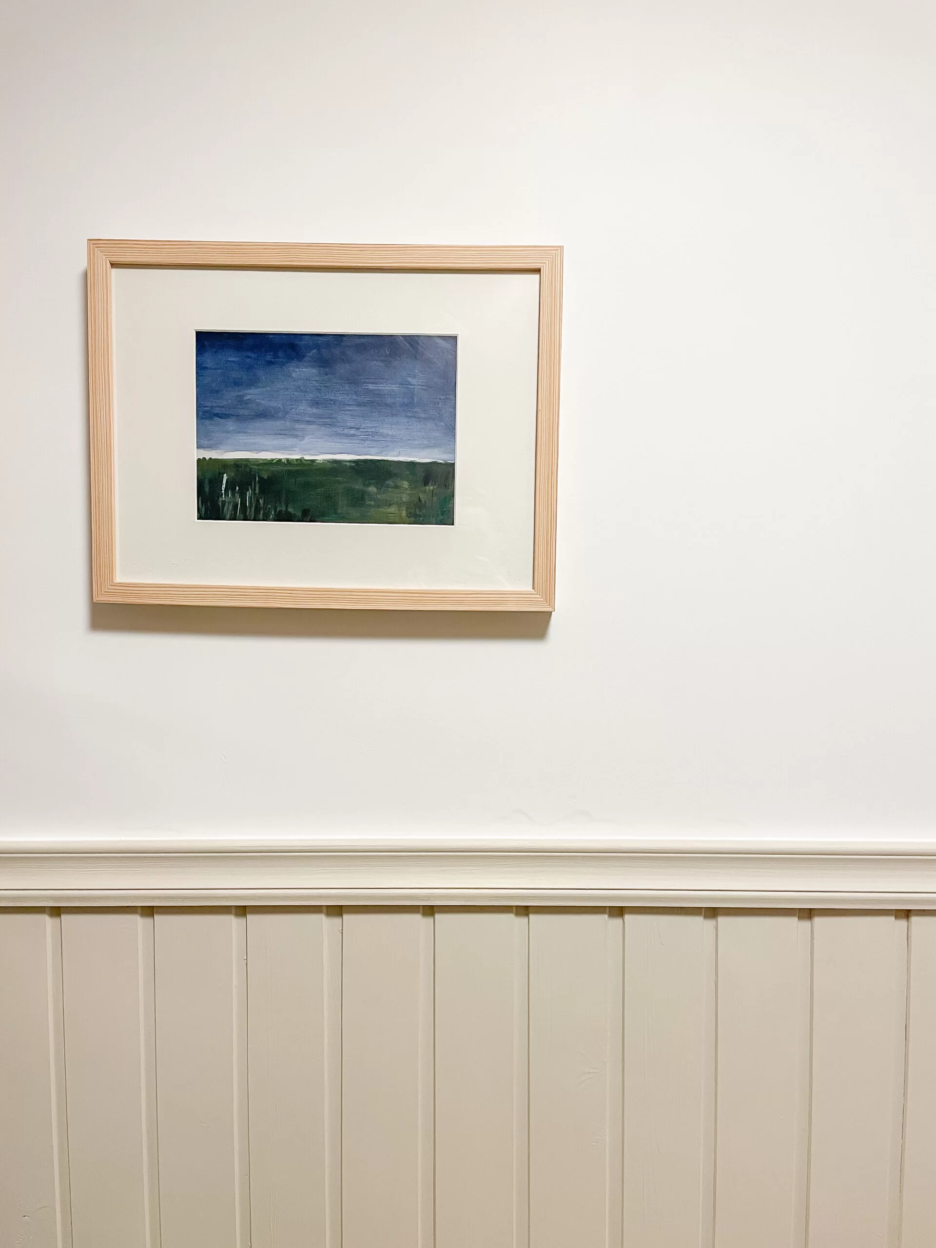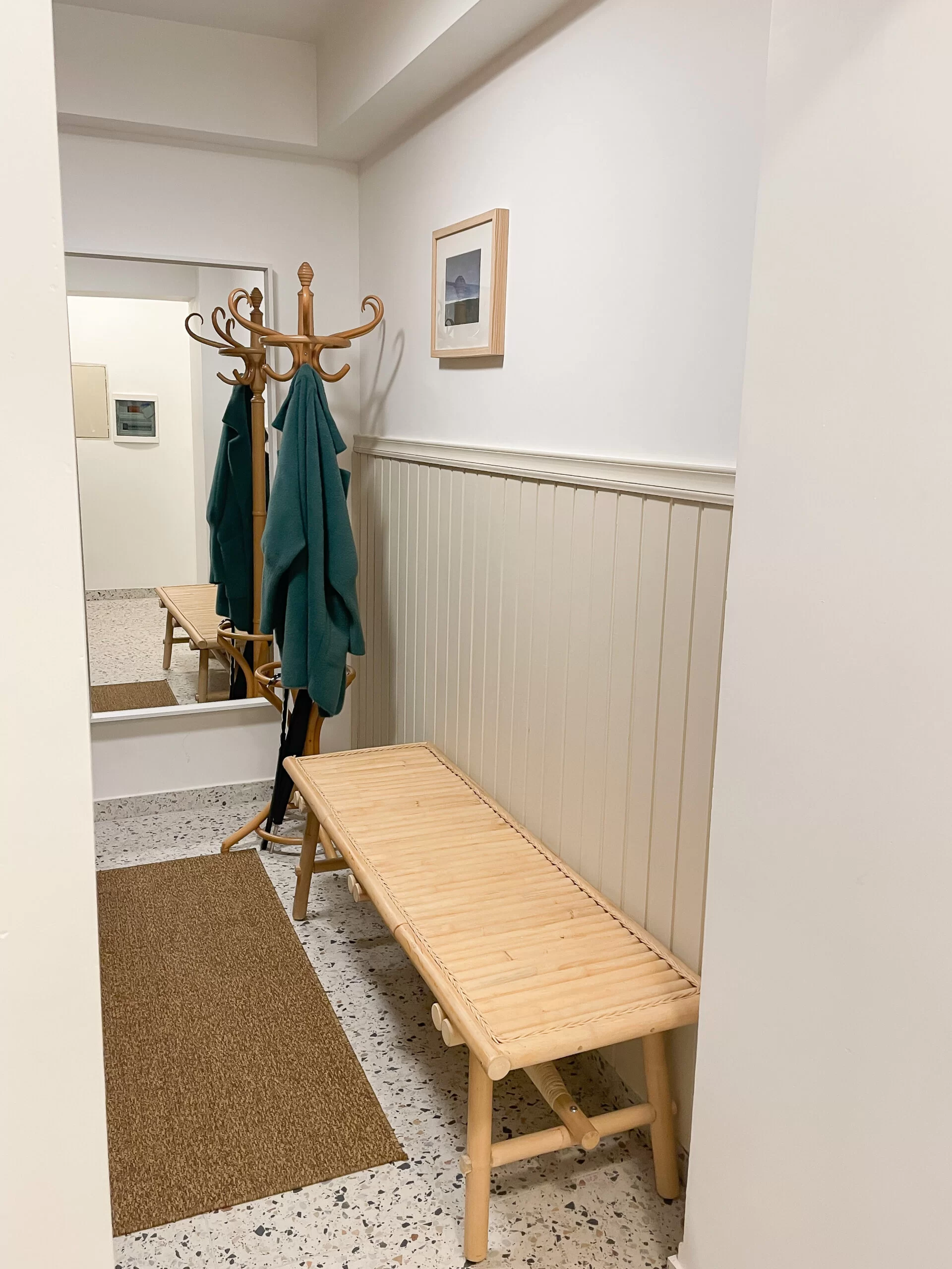 Wnętrze uzupełniliśmy pasującymi dodatkami. Zawiesiliśmy lustro LINDBYN, a obok postawiliśmy wieszak vintage. Na podłodze położyliśmy pleciony z trawy dywan HELLESTED. Jest i nasza bambusowa ławka IKEA, której nie ma już w sprzedaży, ale którą tak lubimy, że przyjechała z nami ze starego domu. Pełniła już różne funkcje, ale w tym przedpokoju już raczej zostanie. Nad boazerią powiesiłam przepiękną pracę, którą namalowała dla mnie moja czytelniczka Kasia. Ten wolny kawałek ściany czeka jeszcze na zagospodarowanie.