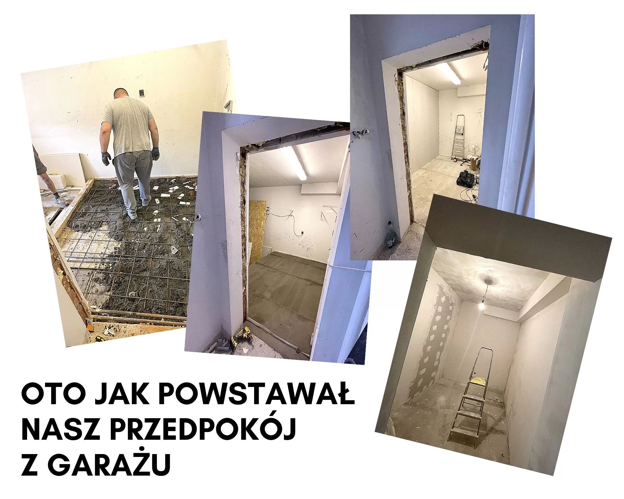 Oto jak powstawał nasz przedpokój. Wejście do garażu było w wiatrołapie. Poszerzyliśmy ten otwór i zlikwidowaliśmy drzwi. Do garażu schodziło się po trzech schodkach.
