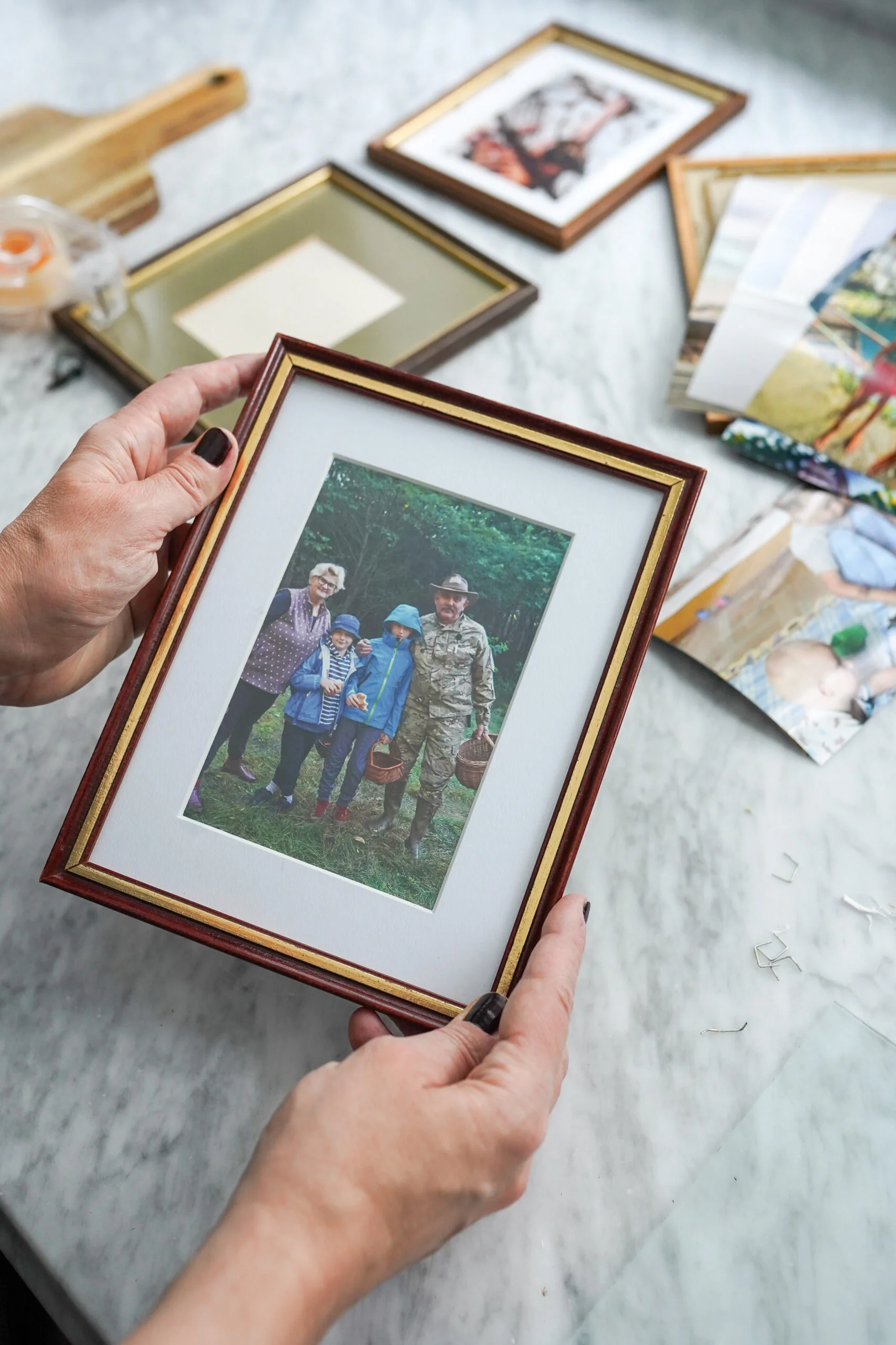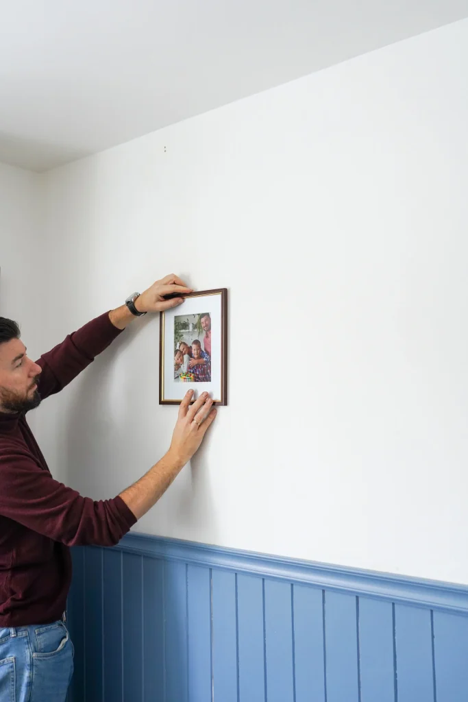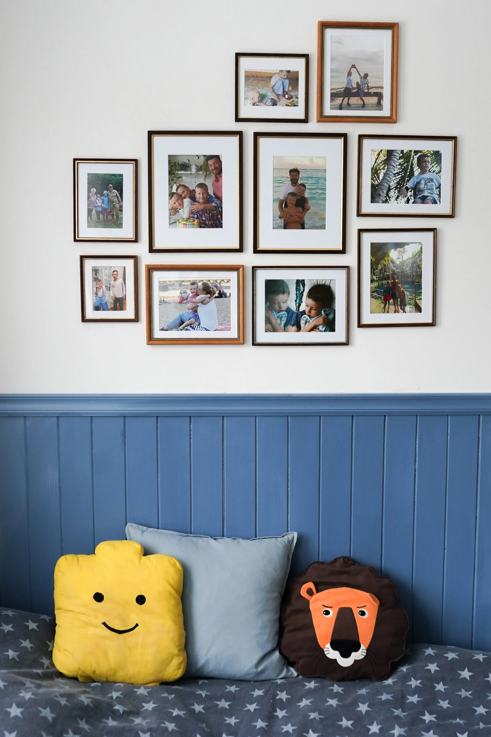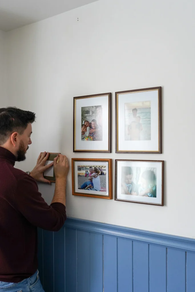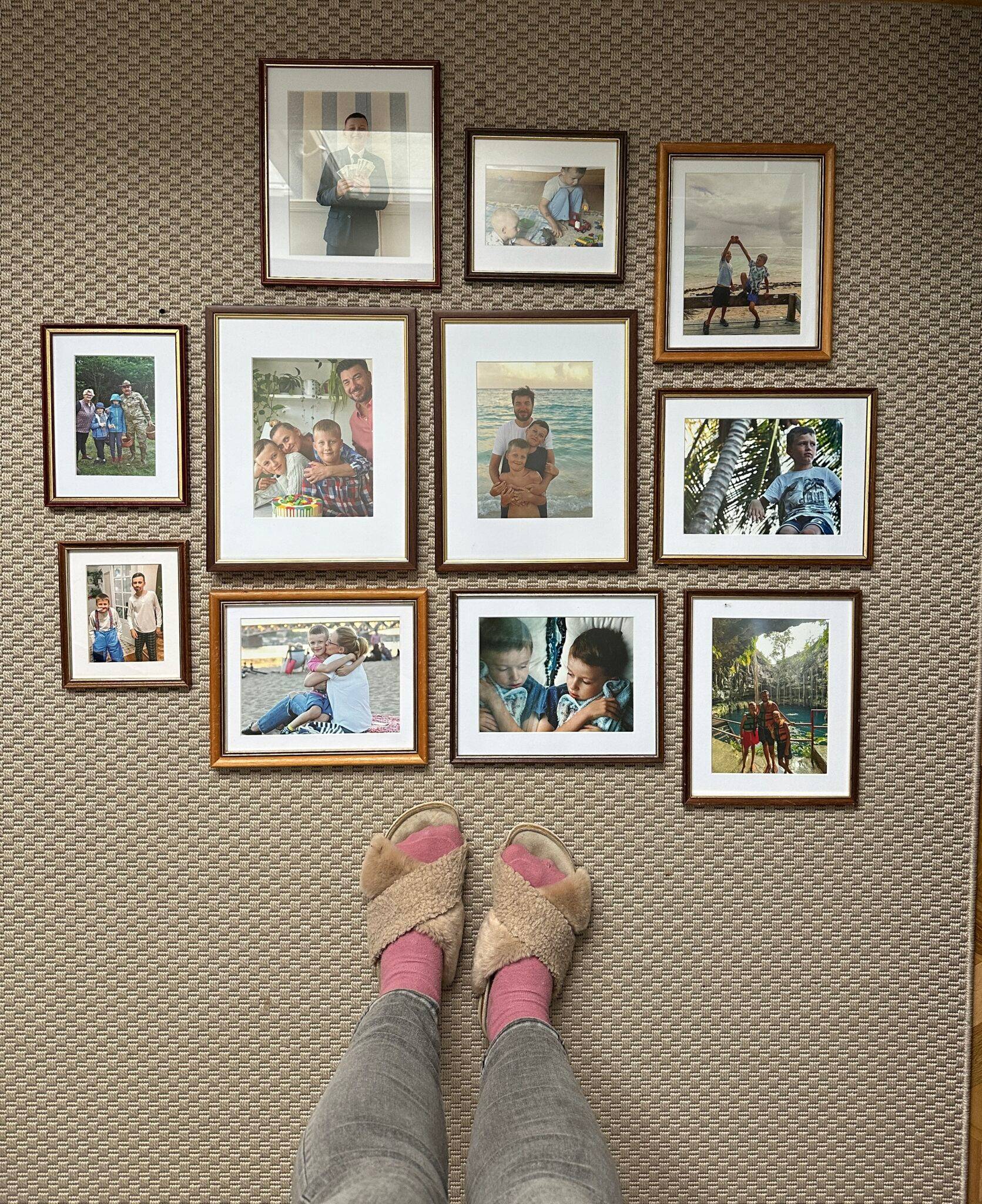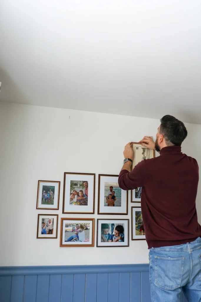 Jeszcze raz układam kolaż ze zdjęć na podłodze. Na koniec wystarczy powiesić ramki na ścianie. Polecam używać cienkich gwoździków, które następnie zahacza się o ramkę. Czasem przydaje się też podklejenie ramki taśmą dwustronną, żeby nie odstawała od ściany.