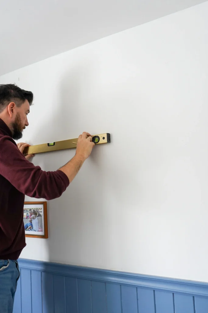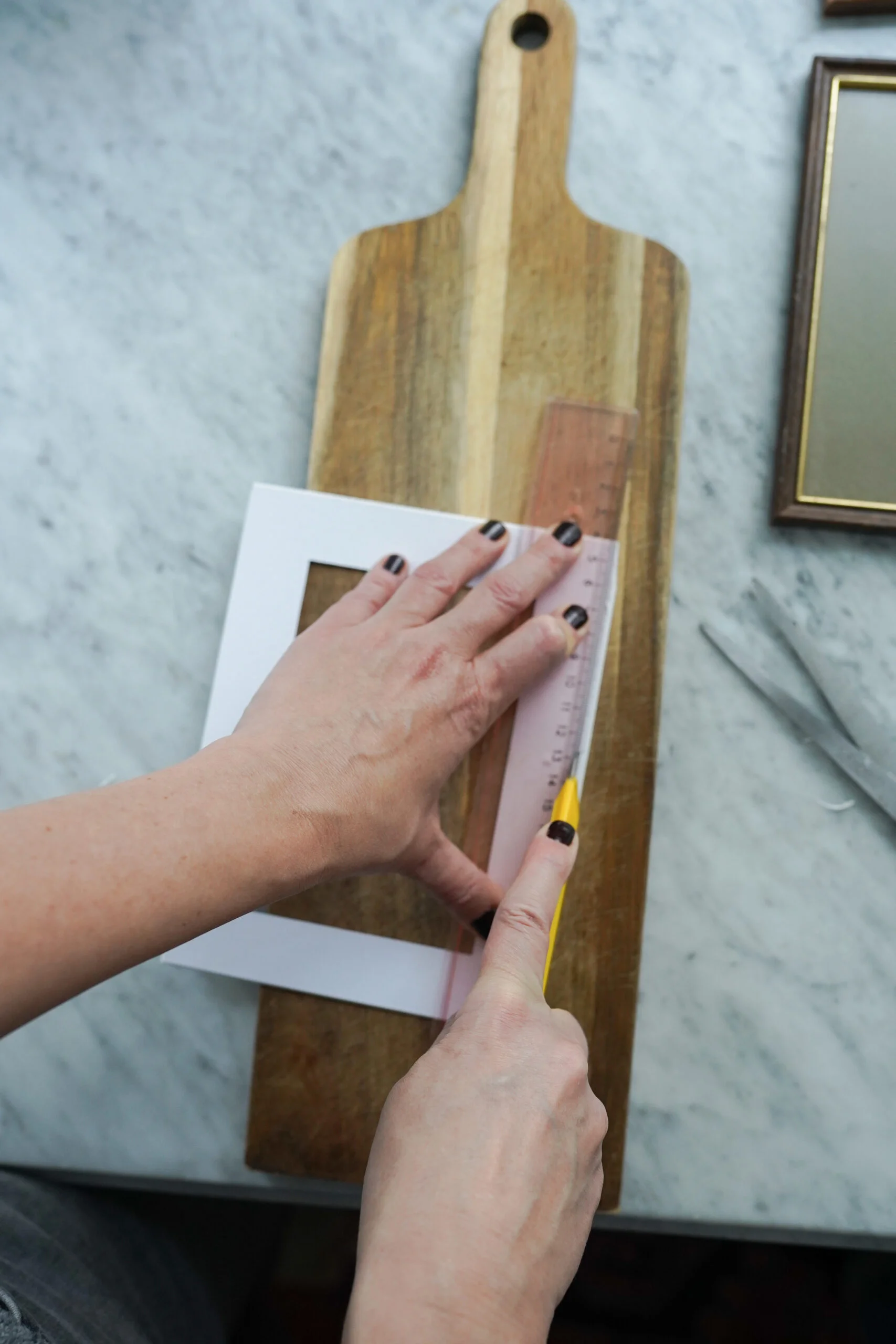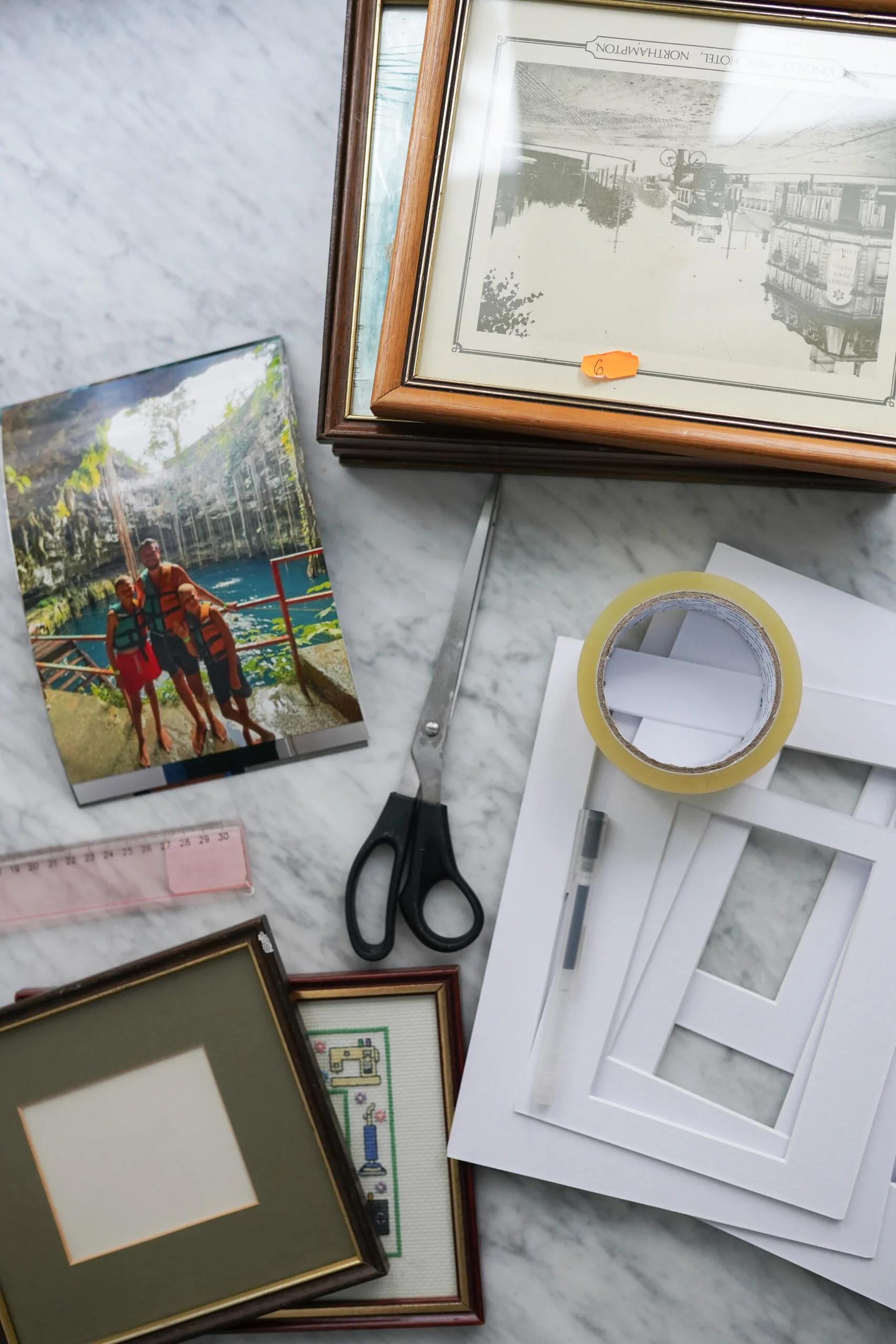 Przygotowuję swoje ramki, passepartout, skalpel, nożyczki, linijkę, deskę do krojenia, mocną taśmę klejącą i małe gwoździki. Przyda się też poziomica, młotek i dwustronna taśma klejąca.