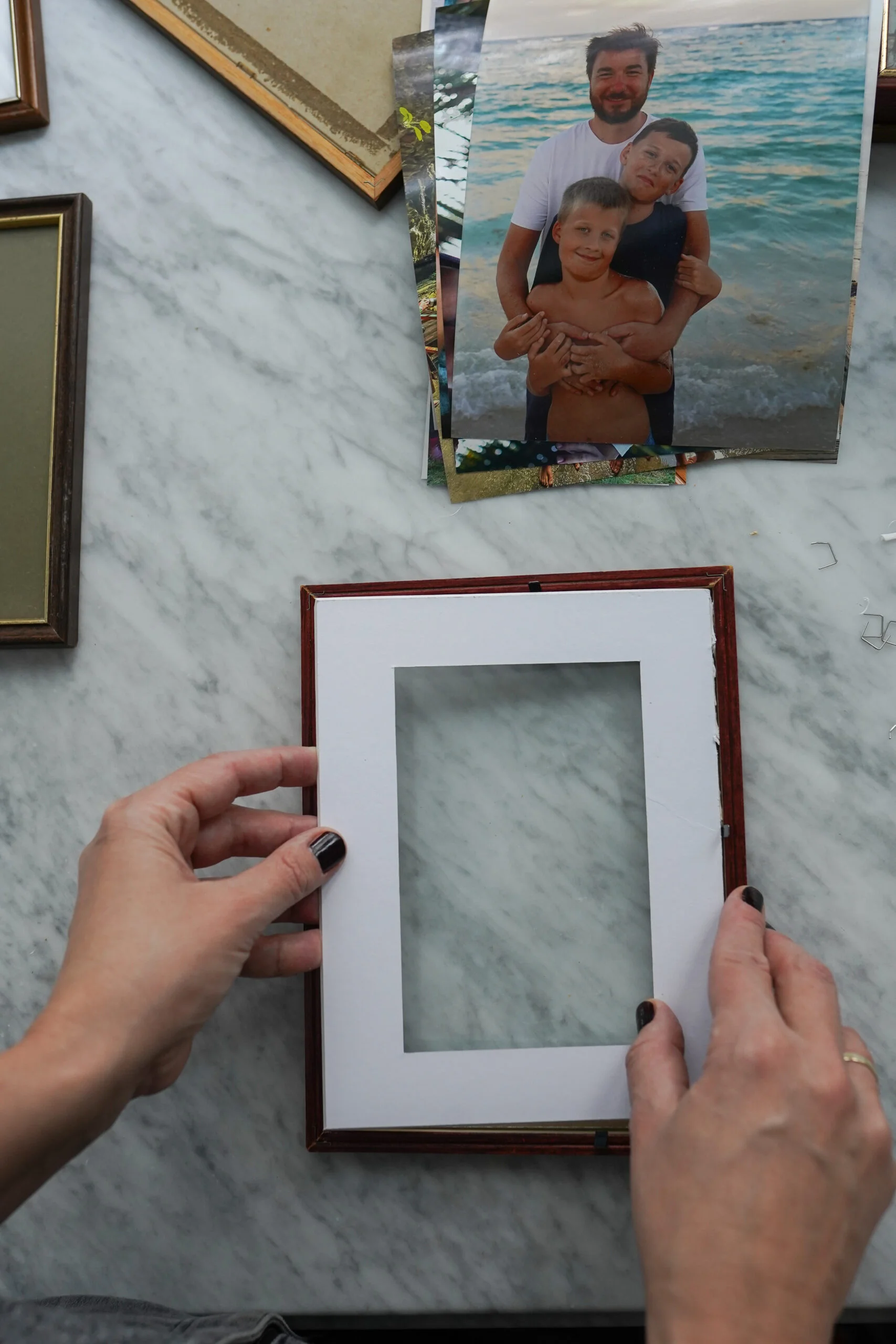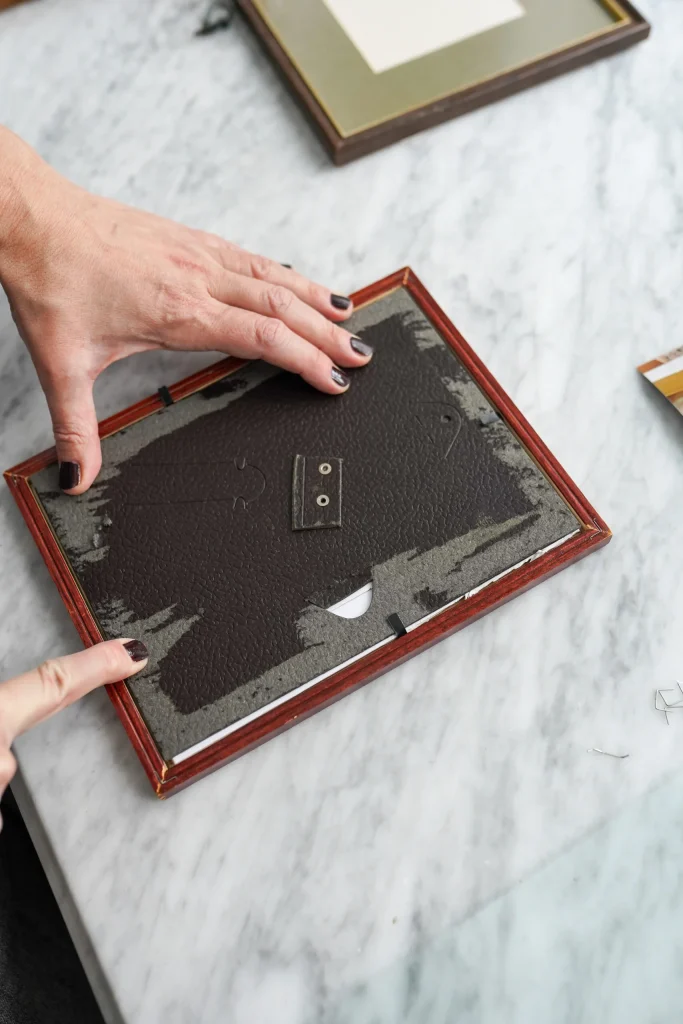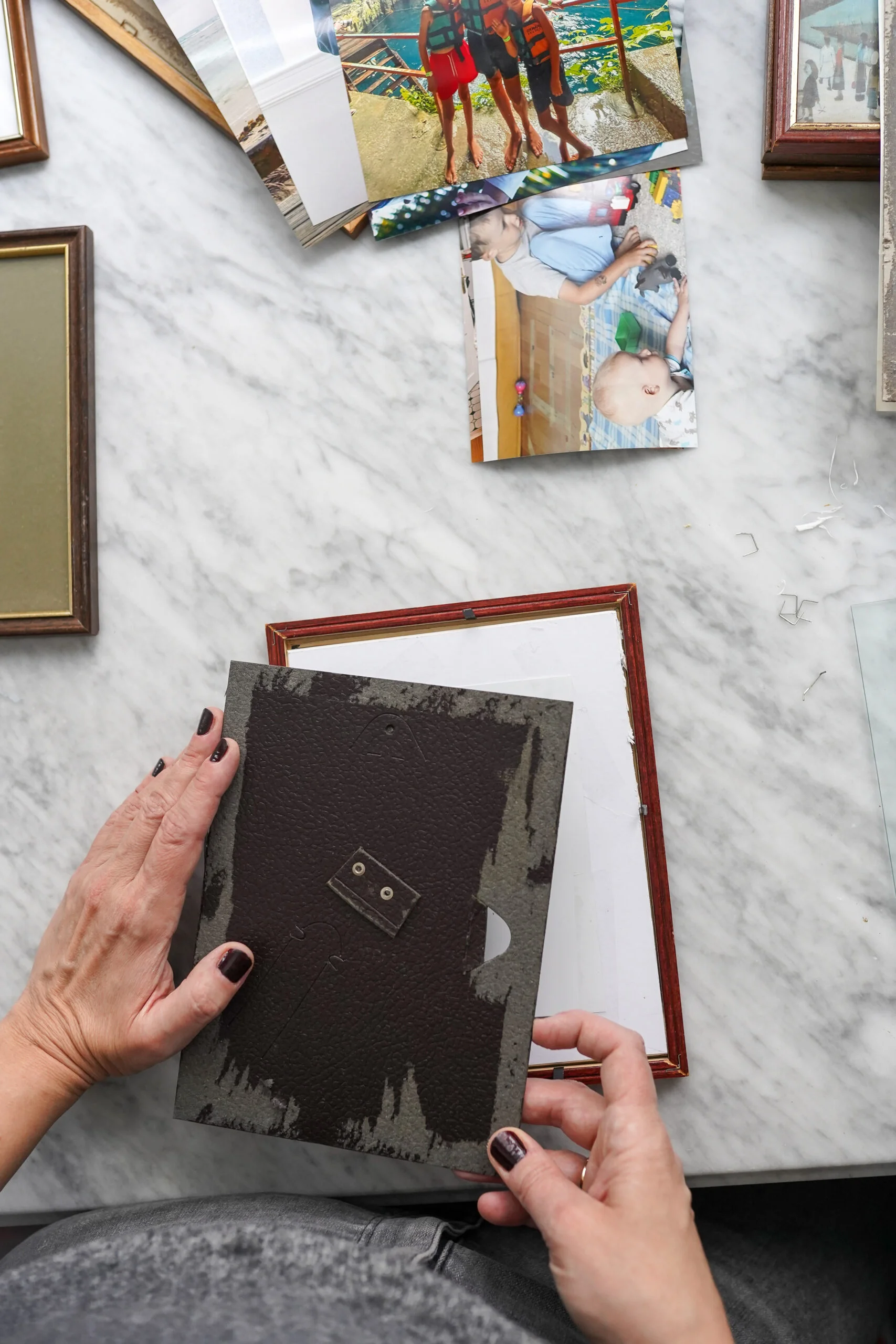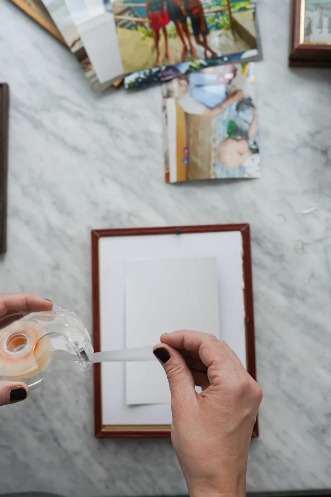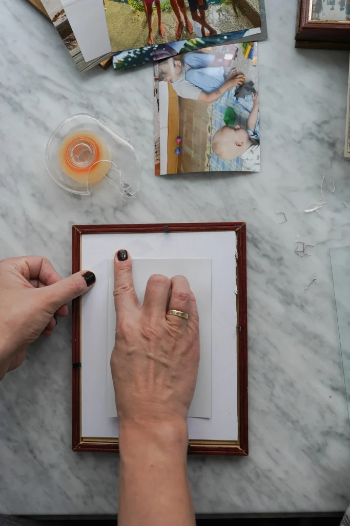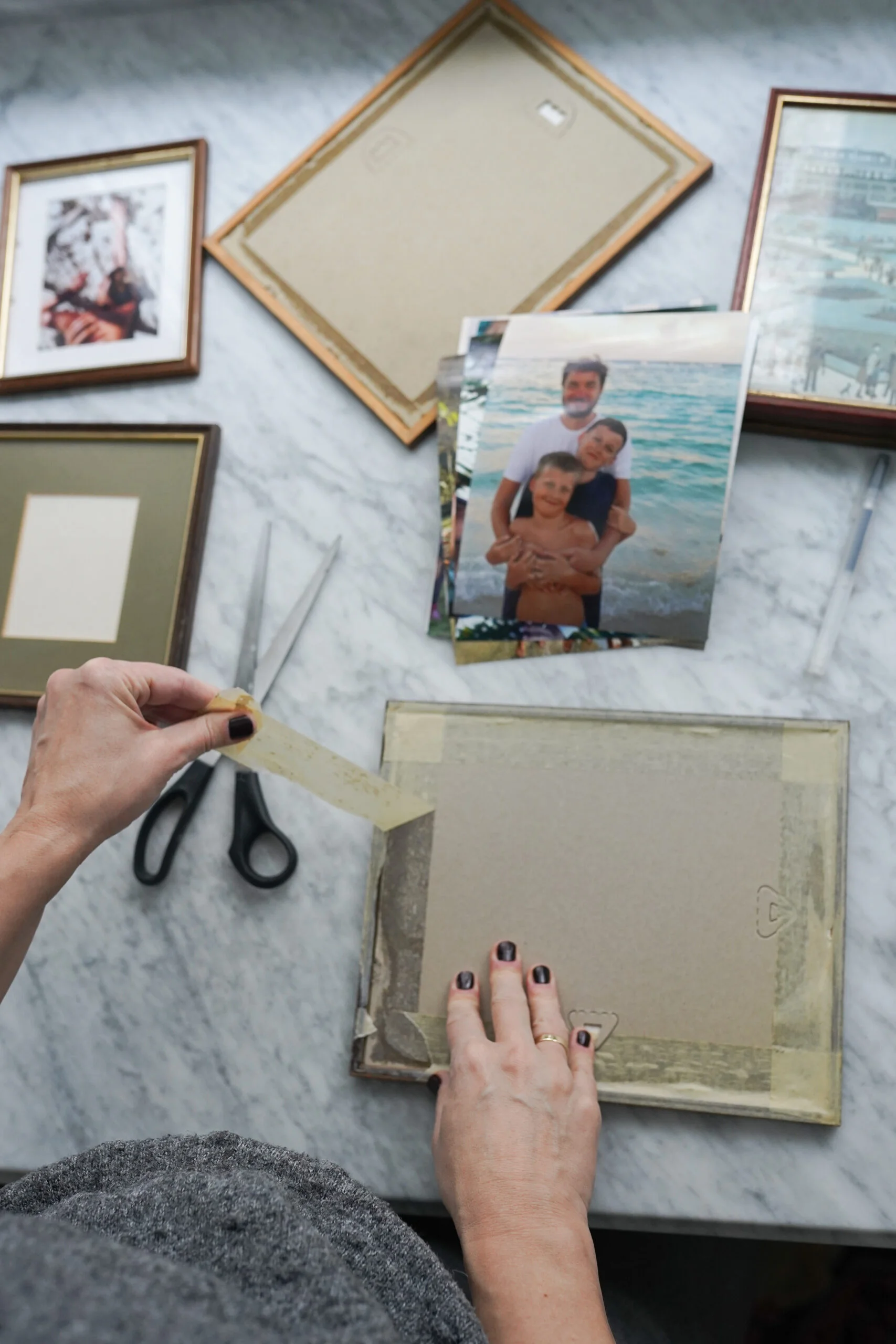 Najpierw pozbywam się starej taśmy klejącej z każdej ramki.
