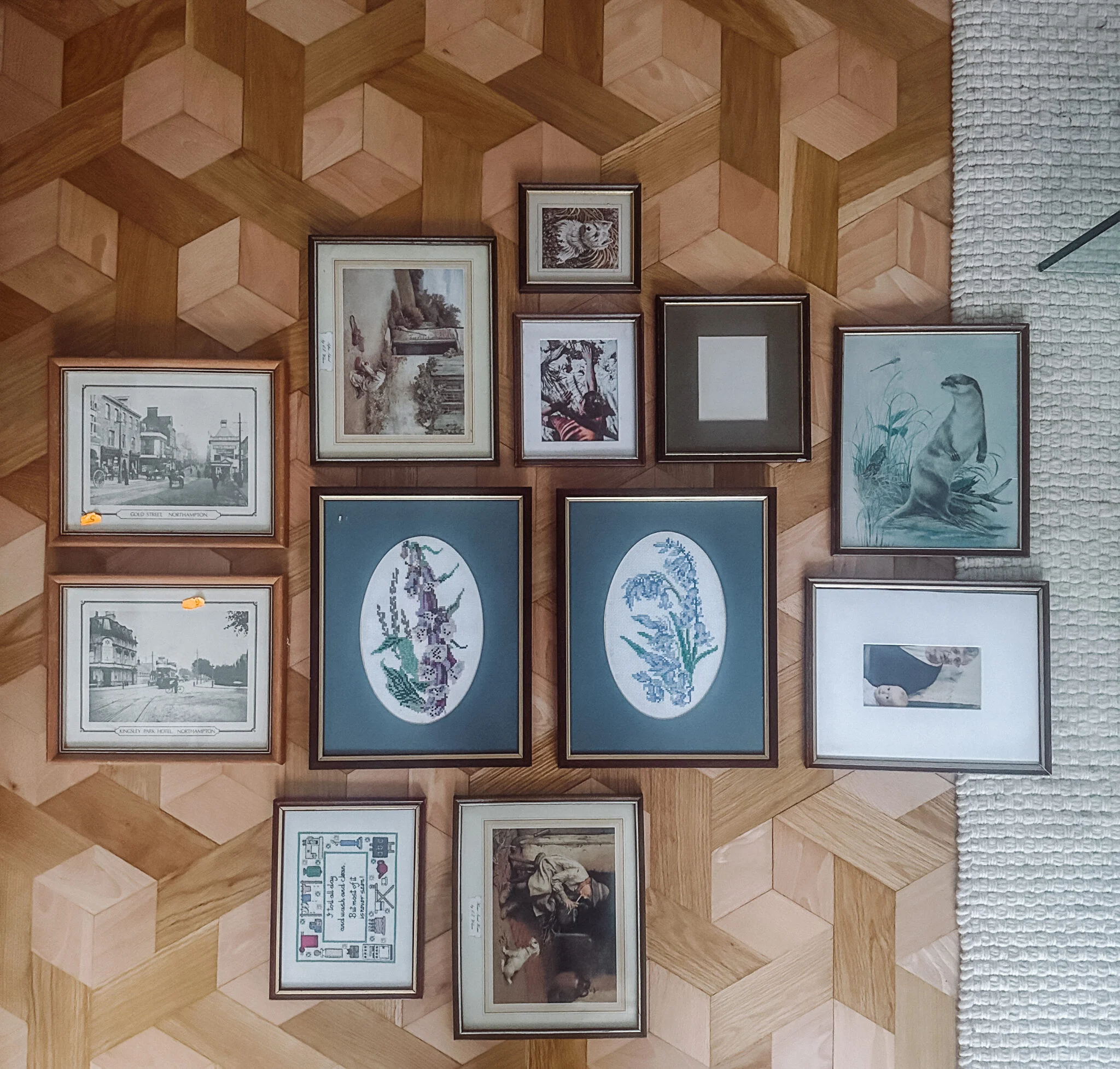 Gdy już mam wszystkie ramki, powoli przymierzam się do kolażu na ścianie, układając różne kombinacje z ramek na podłodze.
