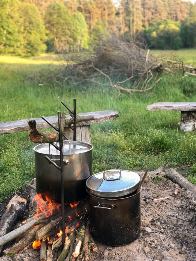 - zestaw naczyń kempingowych (garnek, patelnia, kubki, miseczki, talerze)