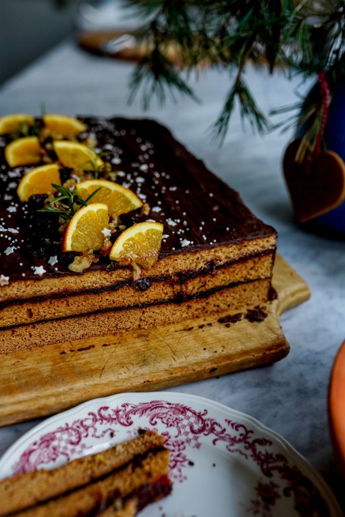Ciasto wyjmujemy łyżką na stolnicę podsypaną mąką. Trzeba się przy tym odrobinę natrudzić, bo ciasto jest dosyć twarde. Zagniatamy je w kulę i dzielimy na trzy części. Rozgrzewamy piekarnik do 180 stopni. Każdą z części ciasta rozwałkowujemy w kształt prostokąta, pamiętając by dobrze podsypywać je z każdej strony mąką, bo lubi się przyklejać. Tak rozwałkowane ciasto układamy na blaszce posmarowanej masłem (możemy też użyć papieru do pieczenia) i pieczemy przez ok. 20-25 min, aż będzie złote. Postępujemy tak samo z pozostałymi częściami ciasta. Na dużej desce do krojenia lub tacy układamy pierwszy, piernikowy spód i smarujemy go całym słoikiem konfitury. Najlepiej śliwkowej lub porzeczkowej. Na to kładziemy kolejny spód, znowu smarujemy słoikiem konfitury i przykrywamy trzecim spodem. Tak przygotowany piernik zawijamy w folię spożywczą, przygniatamy czymś ciężkim (u mnie to książki i garnek żeliwny) i wynosimy w chłodne miejsce (u mnie balkon) najlepiej na 3 dni. Po tym czasie przygotowujemy polewę. Tabliczkę gorzkiej i mlecznej czekolady rozpuszczamy w kąpieli wodnej, dodajemy 100 g masła i energicznie mieszamy. Ciepłą polewą polewamy piernik i dekorujemy np. tak, jak na moim zdjęciu.