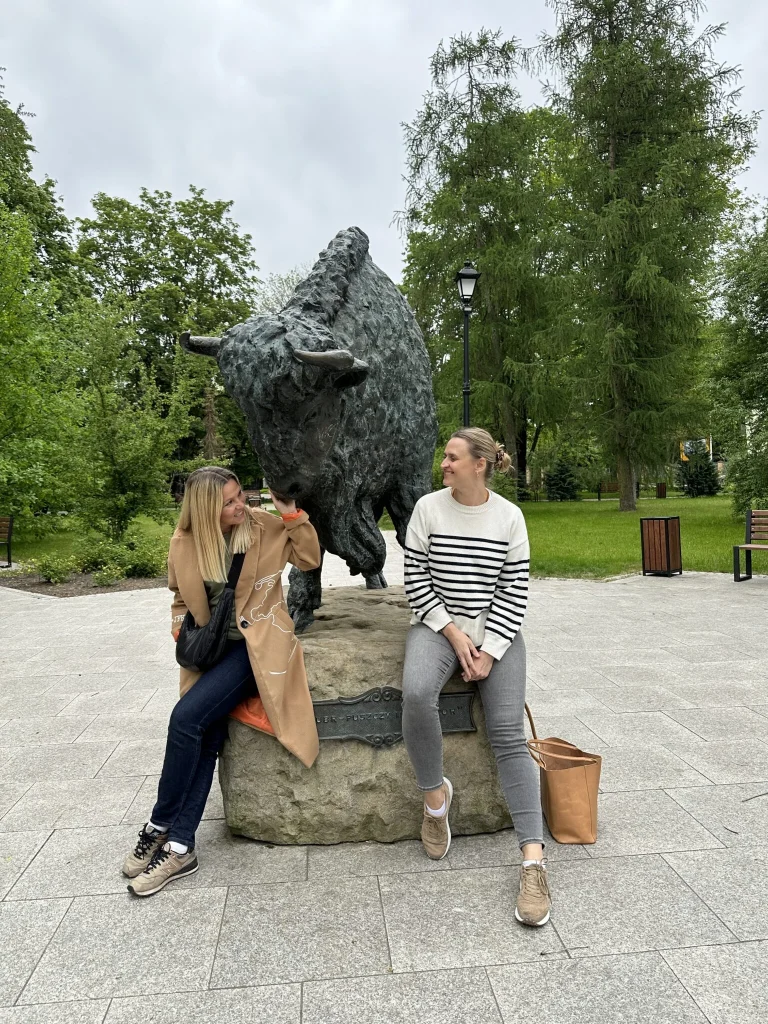 Gdzie w Hajnówce wszyscy się umawiają? Oczywiście pod pomnikiem żubra, Króla Puszczy. Znajdziesz go bez problemu, bo Hajnówka to małe miasteczko, w którym wszędzie jest blisko. Podobno dotknięcie żubra w newralgicznym miejscu przynosi szczęście. Prawdopodobnie turyści i okoliczni mieszkańcy się do tego stosują, bo żubr jest mocno wypolerowany w jednym miejscu 🙂